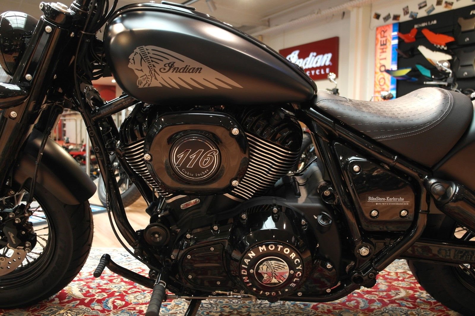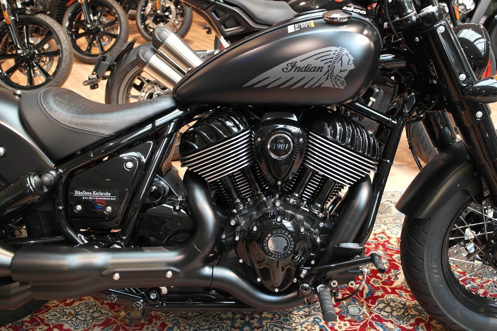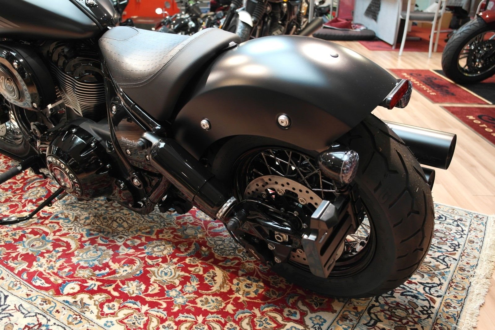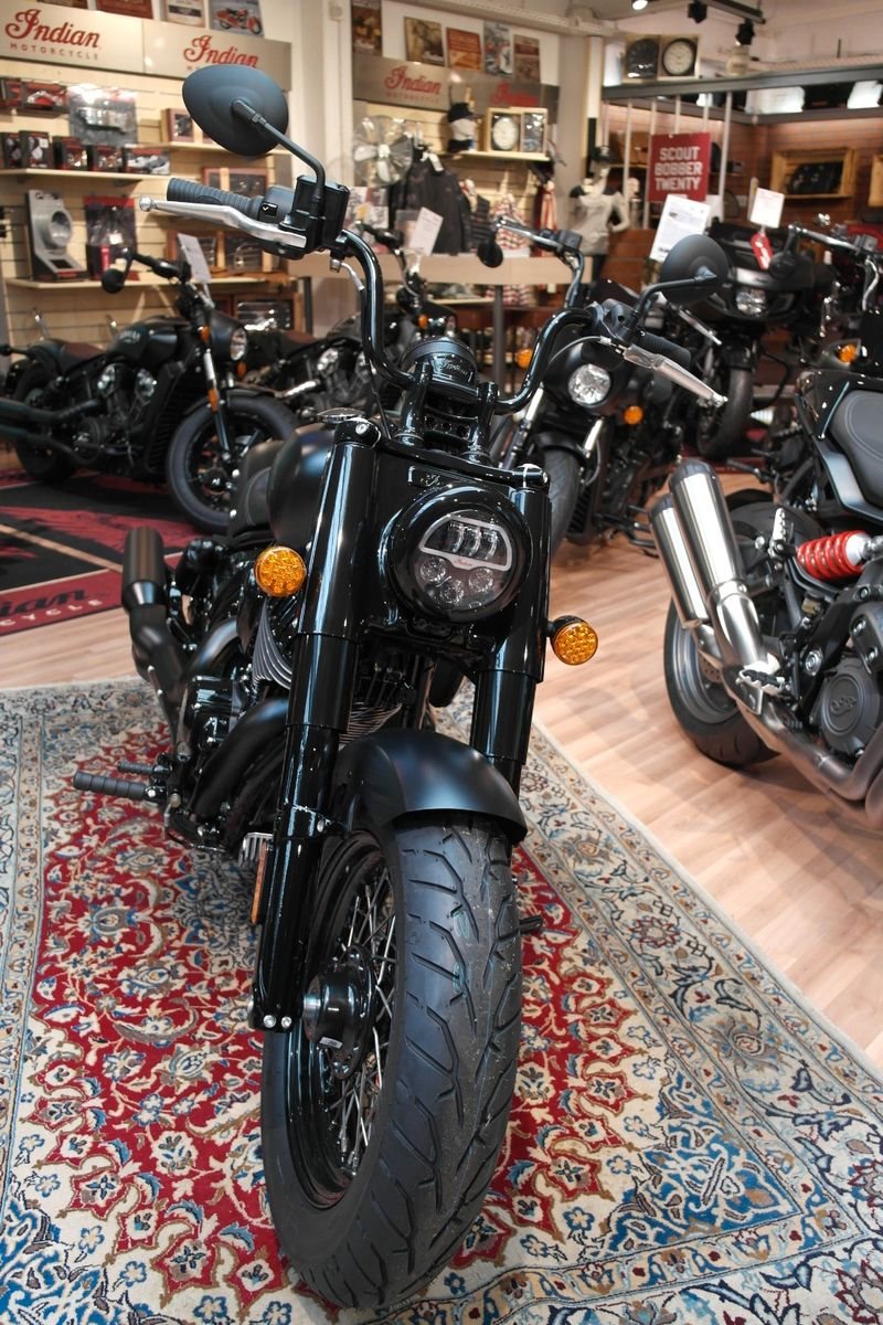 Der Mini-Ape der Indian Chief Bobber in Verbindung mit den nach vorne verlegten Fußrasten sorgt für eine aufrechtere und souveräne Sitzposition. Die Chief Bobber Dark Horse steht auf 16-Zoll-Speichenrädern (40,6 cm), hat zusätzliche Gabel- und Stoßdämpferabdeckungen und verfügt über einen großen, verkleideten Scheinwerfer.