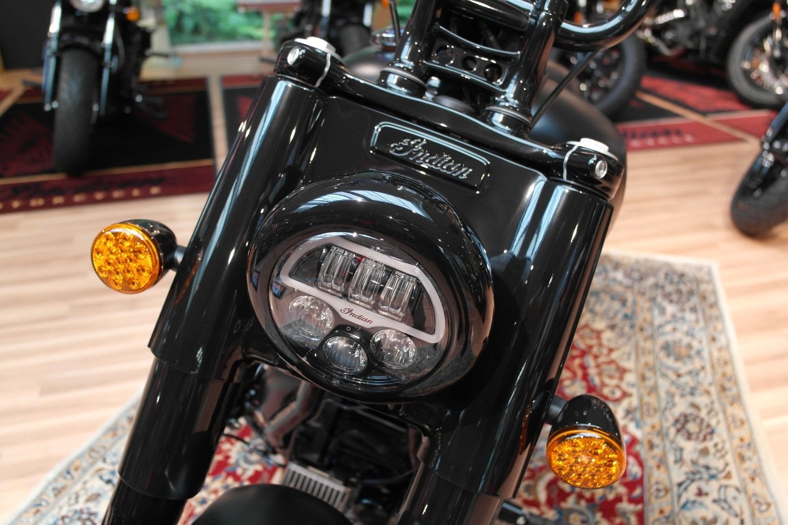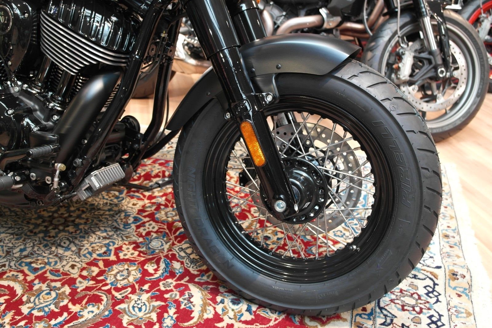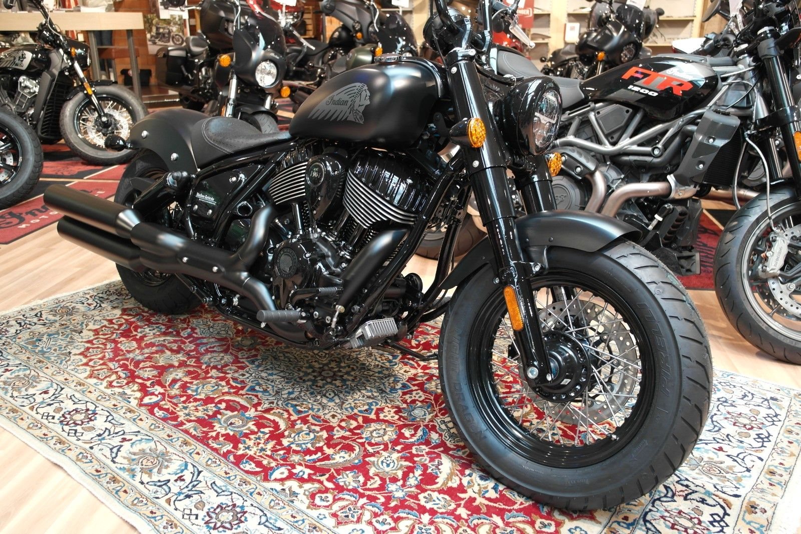 Der Mini-Ape der Indian Chief Bobber in Verbindung mit den nach vorne verlegten Fußrasten sorgt für eine aufrechtere und souveräne Sitzposition. Die Chief Bobber Dark Horse steht auf 16-Zoll-Speichenrädern (40,6 cm), hat zusätzliche Gabel- und Stoßdämpferabdeckungen und verfügt über einen großen, verkleideten Scheinwerfer.