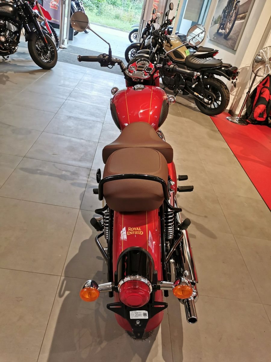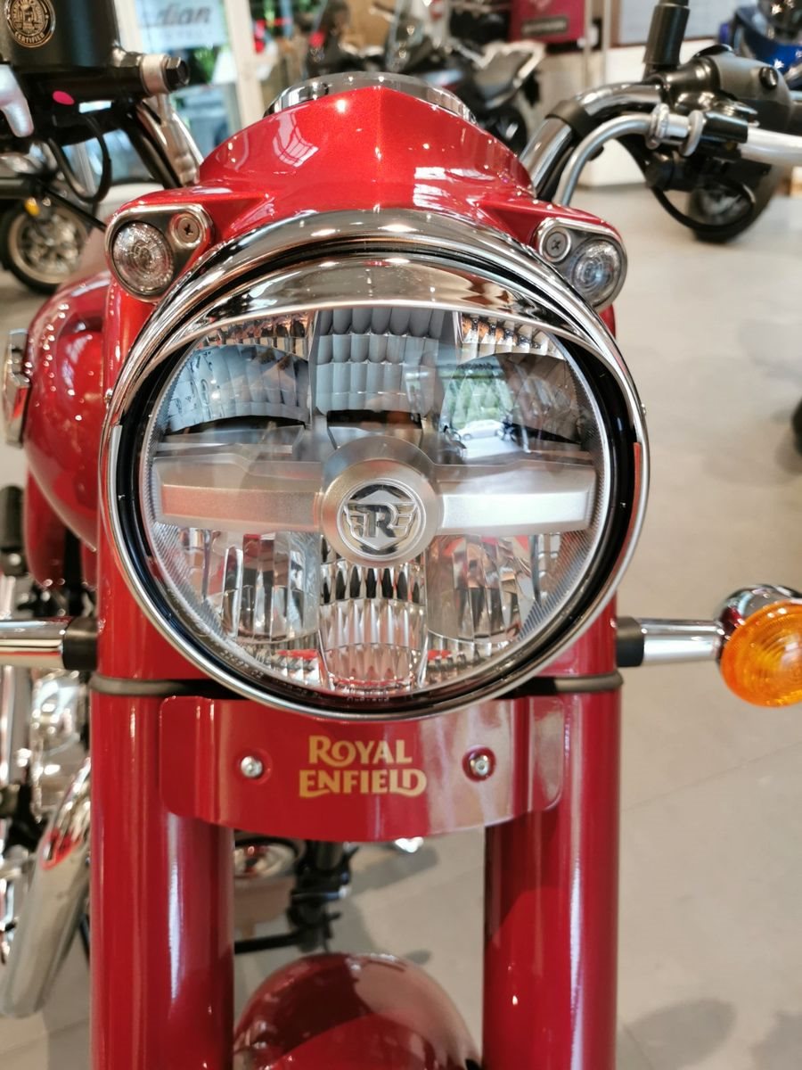 Die neue Classic 350 verkörpert gleicherweise Tradition und die Handwerkskunst der Vergangenheit, wie auch die Wiedergeburt durch die neue J Plattform. Inspiriert vom Nachkriegsmodell G2, das erstmals im Jahre 2008 entstand, schafft es die Classic 350 im Jahr 2021 weiterhin zeitlos ästethisch zu sein. Die geschwungenen Kotflügel und der tropfenförmige Kraftstofftank, die charakteristischen Kassettenscheinwerfer, die einzigartige Lackierung und der unverwechselbare Klang der aus dem Auspuff ertönt harmonieren in sich und machen dieses Meisterwerk zu dem was es ist - eine zeitlose Royal Enfield Classic. Elegant, mit einem glänzenden Finish, das eine außergewöhnliche Kontrusktion ziert, strahlt sie unübertroffene Schönheit und Qualität aus, die die Zeit überdauert.